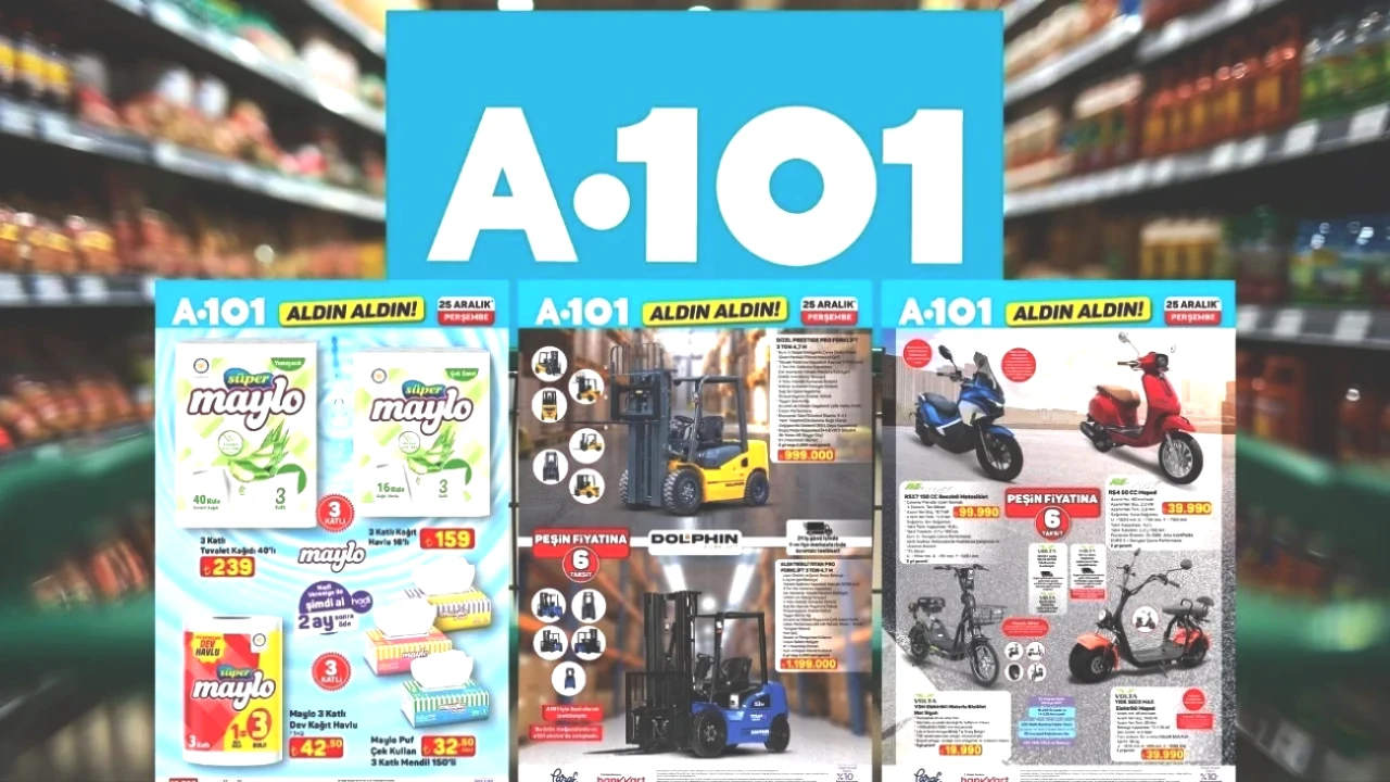 A101'in "Aldın Aldın" indirim broşürü bu haftaki fırsatlarla karşımıza çıkıyor. 18 Şubat 2026 tarihli A101 aktüel kataloğunda birçok yeni ürün uygun fiyatlarla piyasaya sürülüyor. A101'in haftalık indirim kampanyasına göre; 4 çekmeceli şifonyer 2.499 TL, 88 tuşlu katlanabilir taşınabilir piyano 6.299 TL, mermer desenli yer sofrası 449 TL, büyük boy valiz 1.099 TL, 3 katlı tekerlekli raf 199 TL, süngerli baskılı çocuk halısı 329 TL, çok amaçlı katlanabilir ahşap tepsi 249 TL, emaye fırın tepsisi 149 TL, "Ben Kimim?" kutu oyunu 149 TL, oyuncak kodlama labirent oyunu 359 TL, kristal sürahi 89,50 TL, silikon muffin kalıbı 45 TL, kahvaltı seti 179 TL, mutfak ürünleri 29,50 TL, lastik tamir kiti 99,50 TL, kask buhar önleyici 95 TL, oto cam sileceği 69,50 TL, oto telefon tutucu 149 TL, arka koltuk organizeri 175 TL, elektrikli çelik çay makinesi 1.599 TL, kablolu dik süpürge 1.499 TL, 9 kg kurutma makinesi 14.999 TL ve bluetooth hoparlör 499 TL fiyatıyla raflardaki yerini alacak.